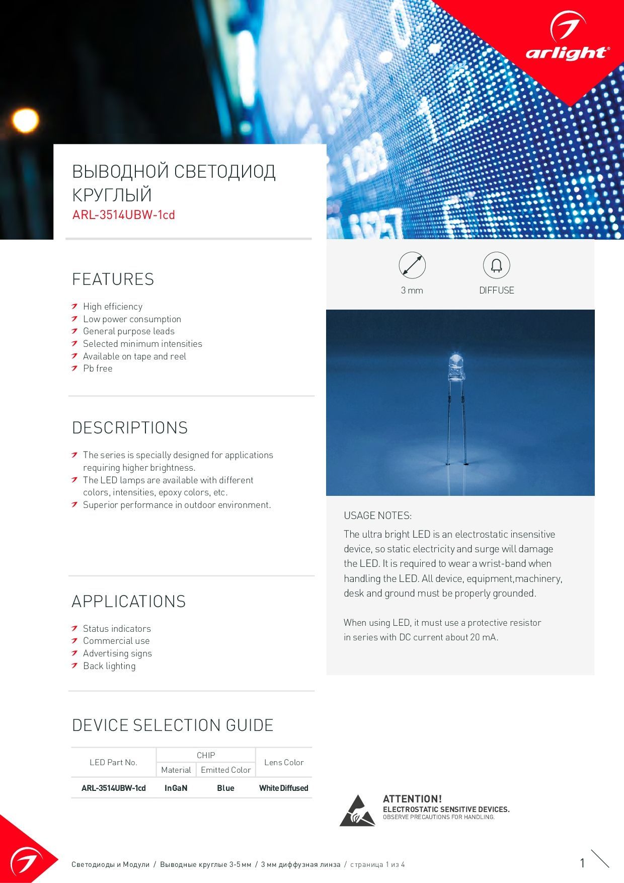 003912 Светодиод ARL-3514UBW-1cd (Arlight, 3мм (круглый))
