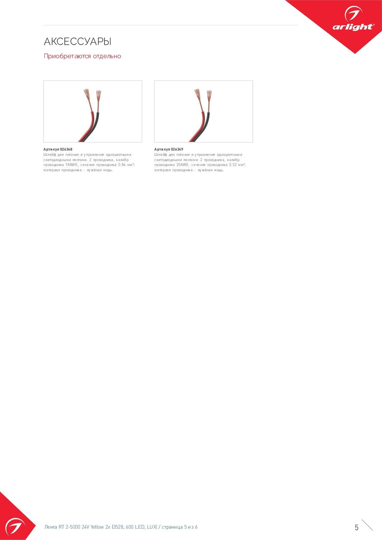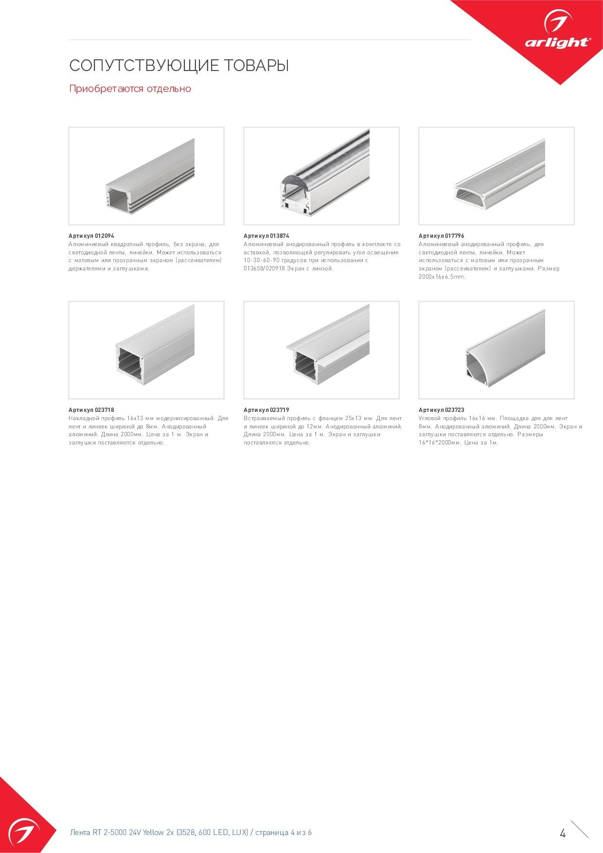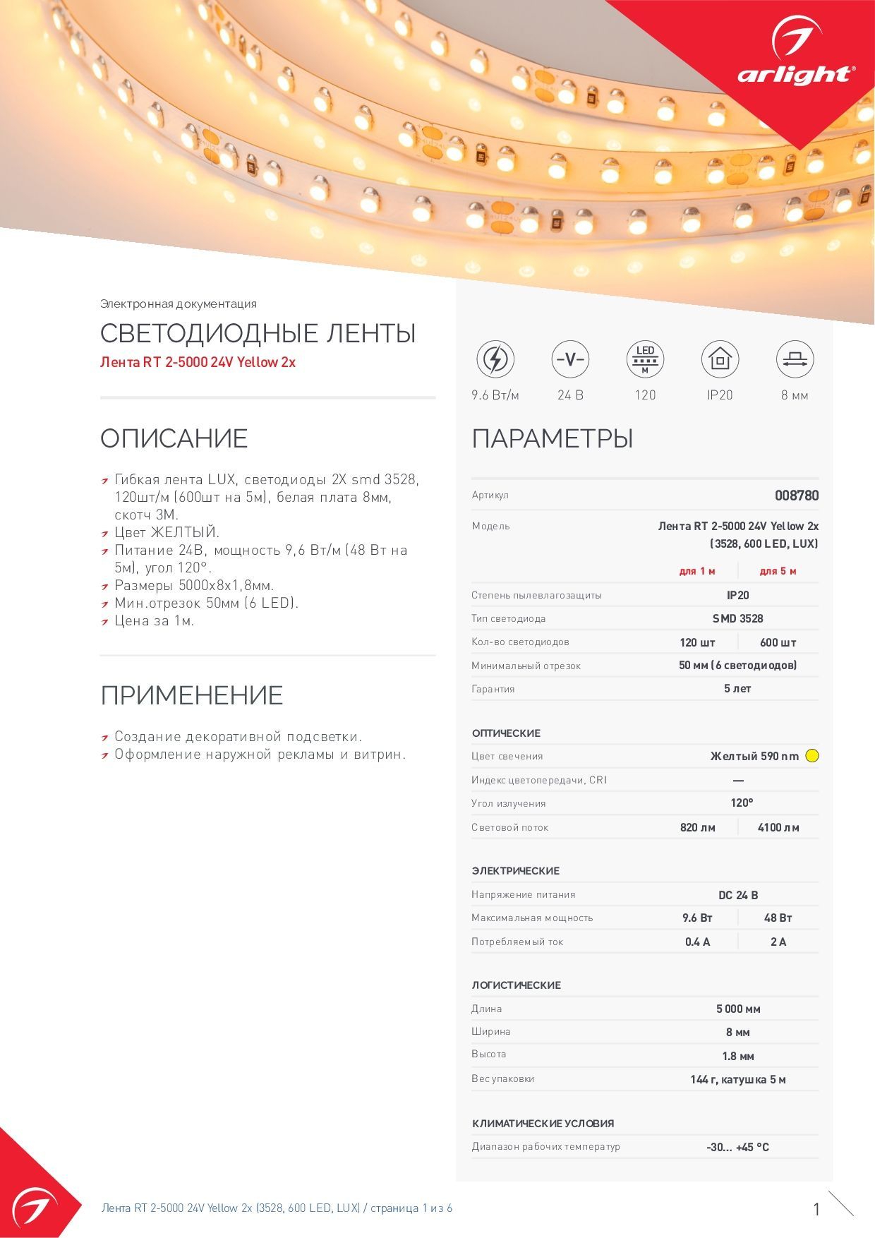 008780 Лента RT 2-5000 24V Yellow 2x (3528, 600 LED, LUX) (Arlight, 9.6 Вт/м, IP20)
