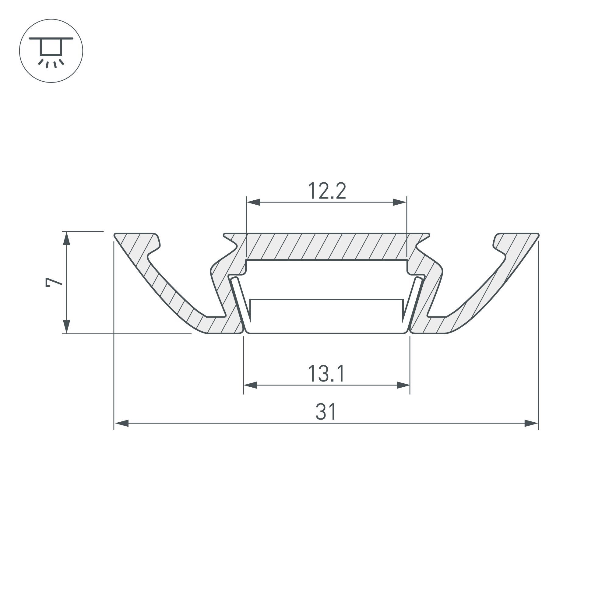 - Размеры: Длина - 2000 мм, ширина - 31 мм, высота - 7 мм, ширина площадки для ленты - 12.2 мм, ширина световой линии - 13 мм.