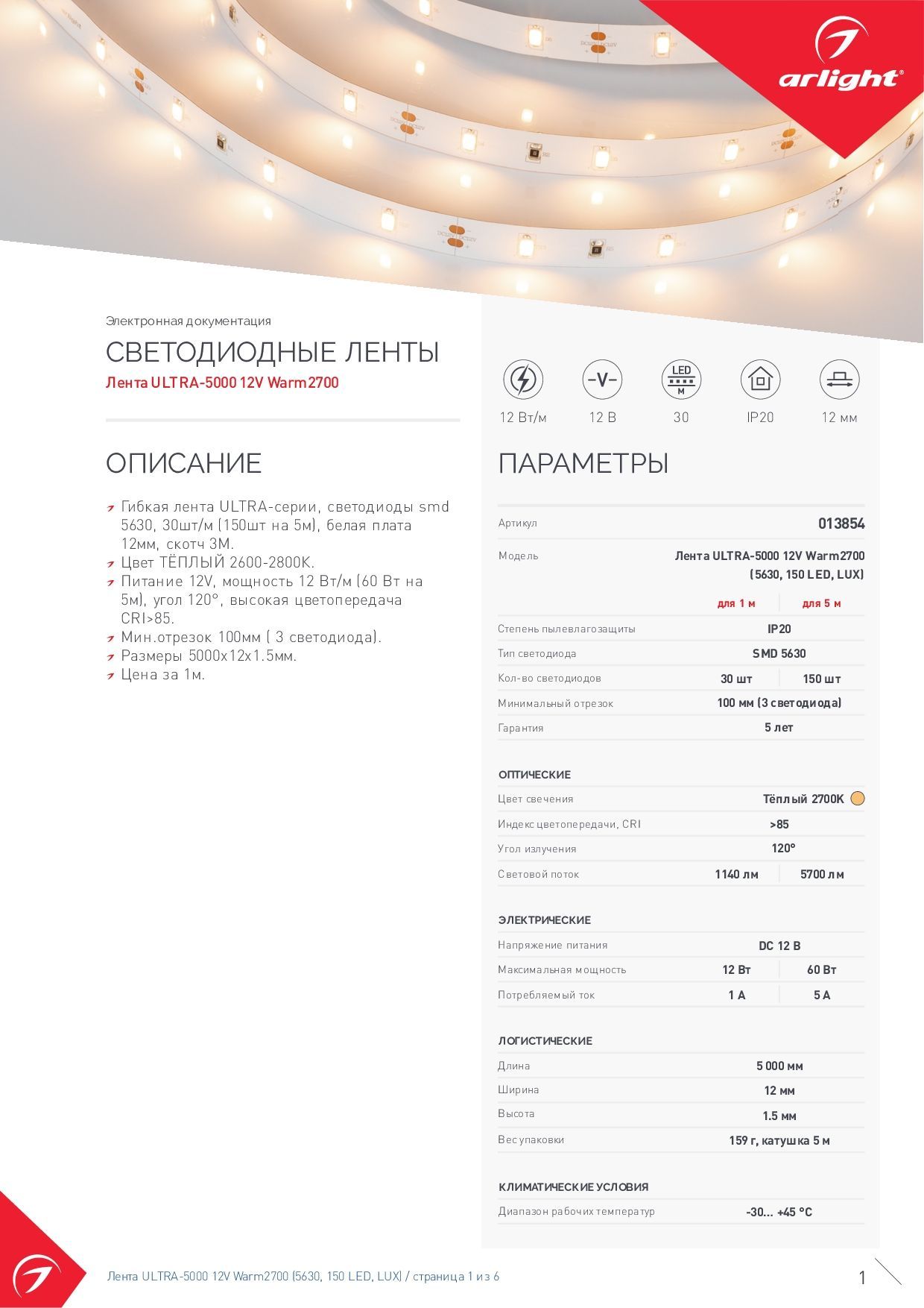 Светодиодная лента Arlight ULTRA-5000 12V Warm2700 (5630, 150 LED, LUX) (Arlight, 12 Вт/м, IP20) (Arlight 013854)