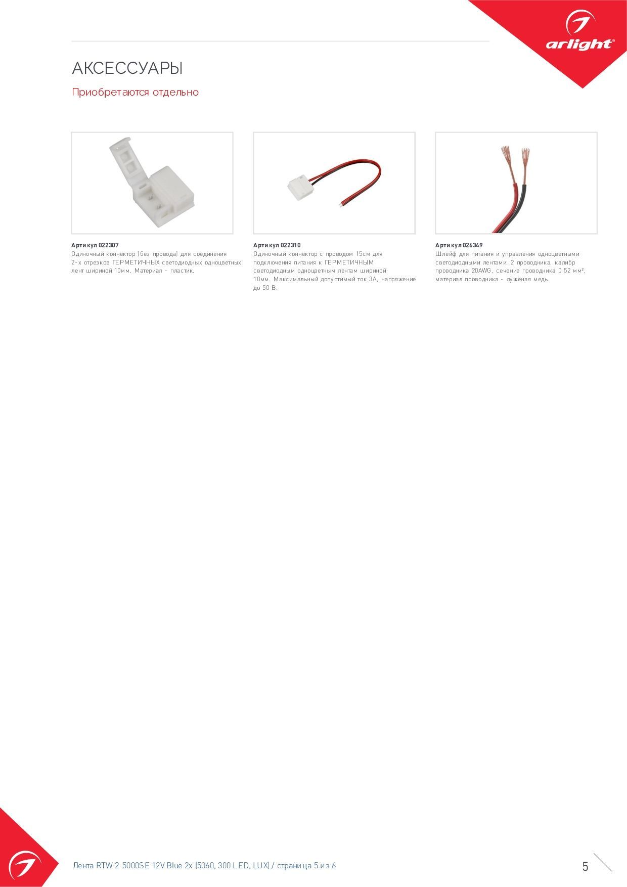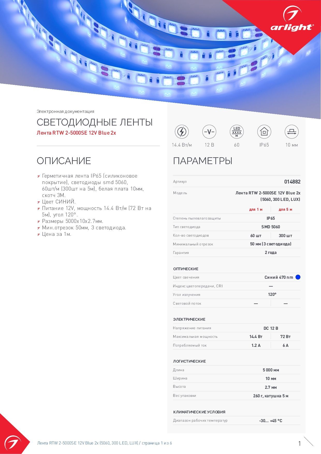 014882 Лента RTW 2-5000SE 12V Blue 2x (5060, 300 LED, LUX) (Arlight, 14.4 Вт/м, IP65)