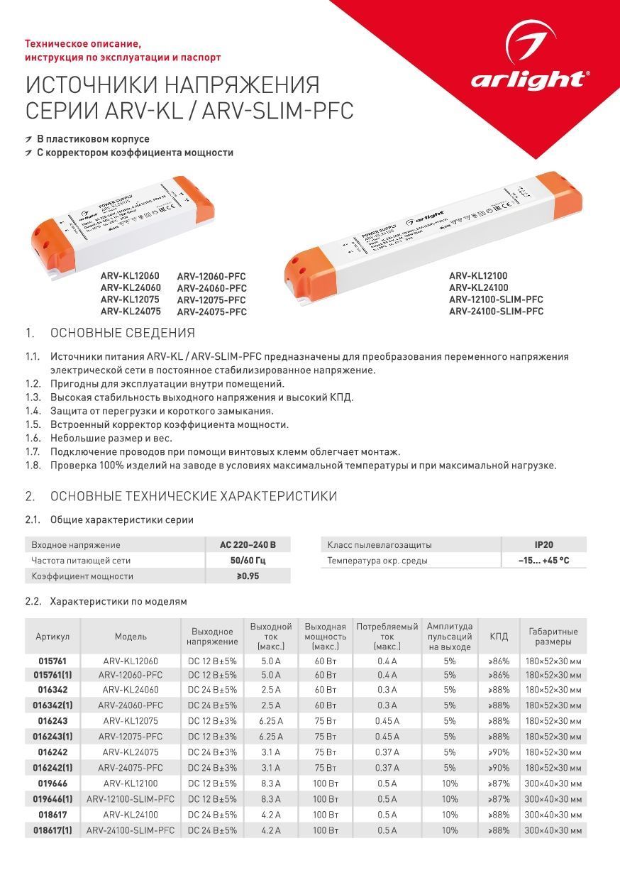 Блок питания ARV-24100-SLIM-PFC (24V, 4.2A, 100W) (Arlight, IP20 Пластик) Arlight 018617(1)