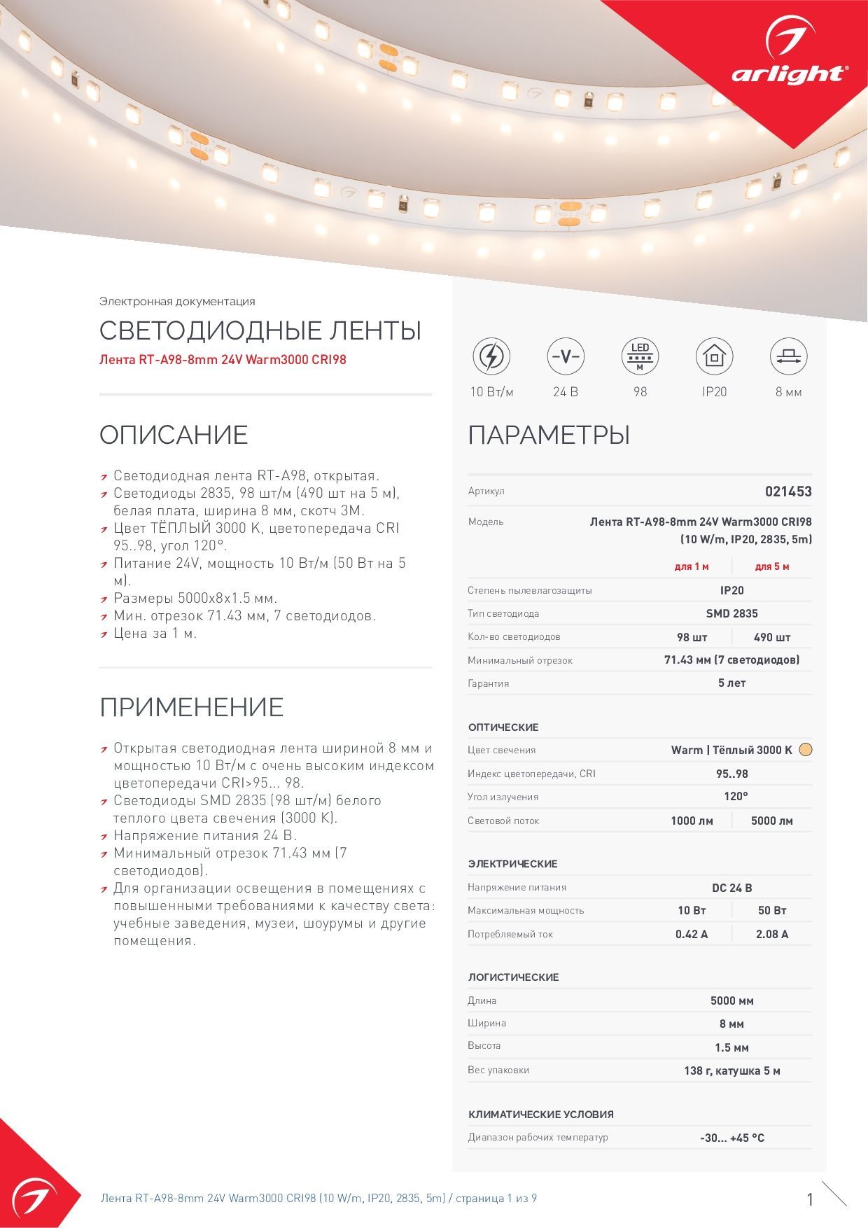 021453(2) Лента RT-A98-8mm 24V Warm3000 CRI98 (10 W/m, IP20, 2835, 5m) (Arlight, Открытый)