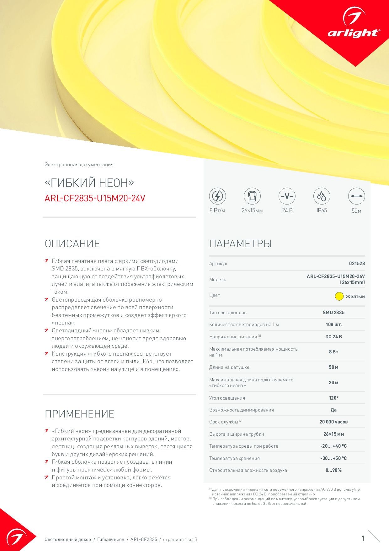 021528 Гибкий неон ARL-CF2835-U15M20-24V Yellow (26x15mm) (Arlight, 8 Вт/м, IP65)