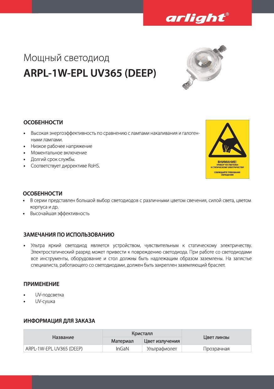 Мощный светодиод ARPL-1W-EPL UV365 (DEEP) (Arlight, Emitter) Arlight 022038