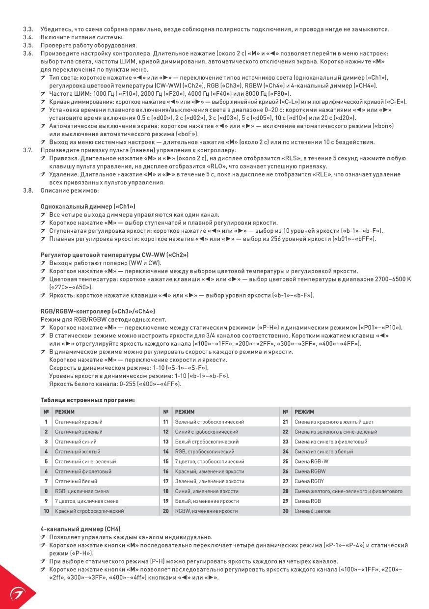 - Радиоканал управления (частота 2.4 ГГц): Обеспечивает стабильную и бесперебойную связь между контроллером и устройствами управления, такими как пульты ДУ или настенные панели. Возможность привязки до 10 устройств управления.