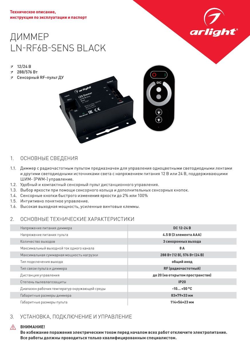 Диммер LN-RF6B-Sens Black (12-24V, 3x8A) (Arlight, IP20 Металл) Arlight 023377