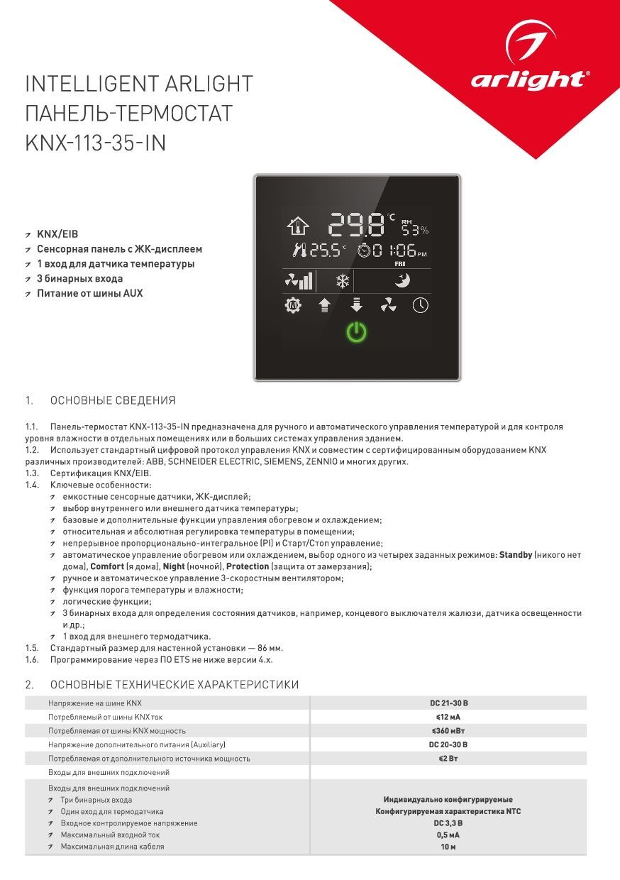INTELLIGENT ARLIGHT Панель-термостат KNX-113-35-IN (AUX, 20-30V, ext.T-sensor) (IARL, IP20 Пластик) Arlight 025670