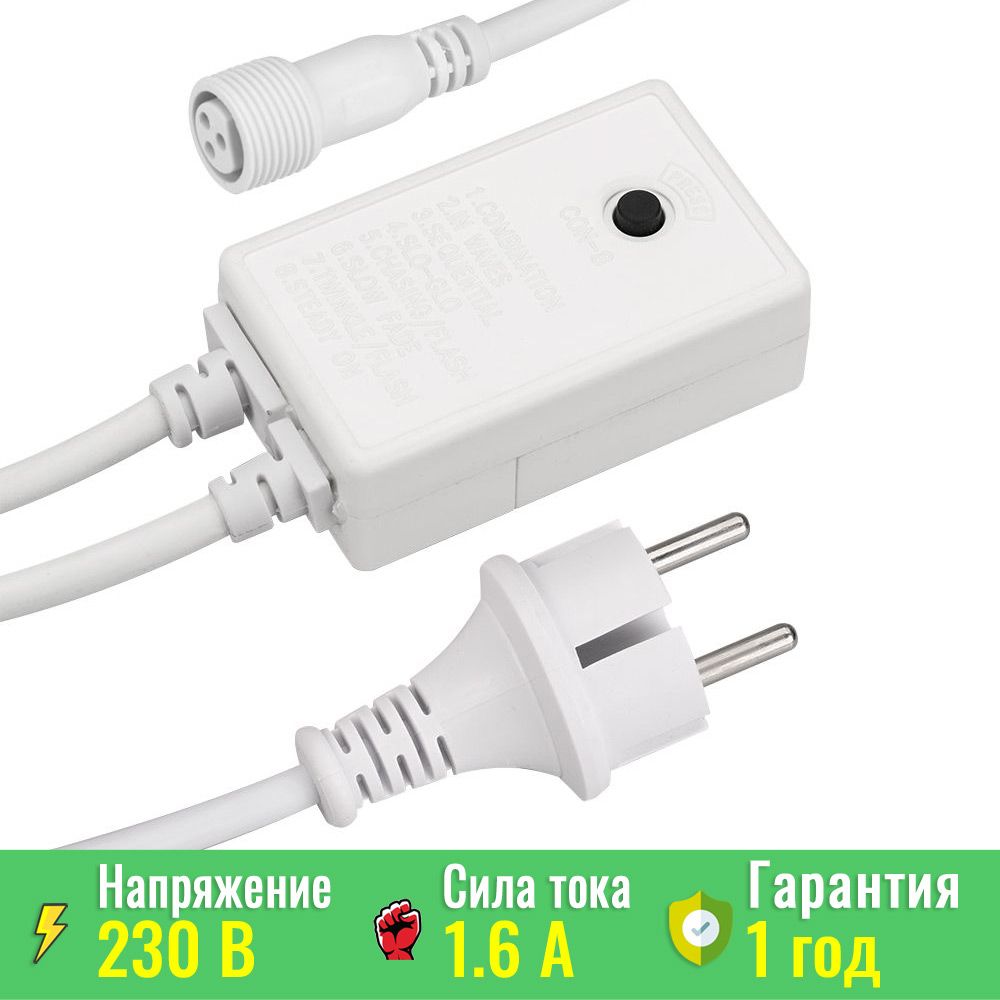 Корпус контроллера выполнен из белого ПВХ высокой прочности, что делает его не только стильным, но и долговечным. Длина провода составляет 1.5 метра, что обеспечивает удобство в установке и позволяет гибко размещать гирлянды в интерьере.