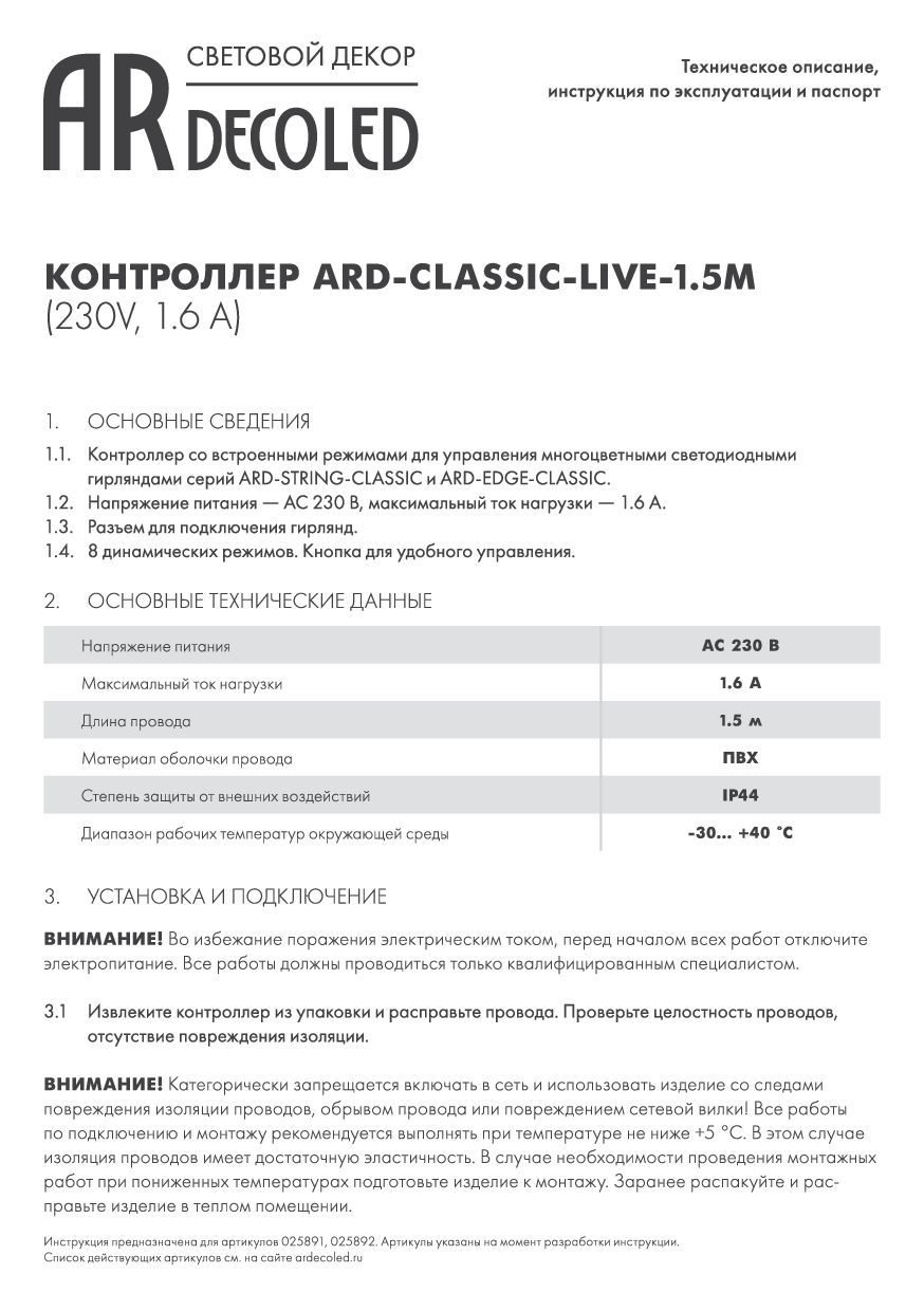 025892 Контроллер ARD-CLASSIC-LIVE-1.5M White (230V, 1.6A) (Ardecoled, Закрытый)
