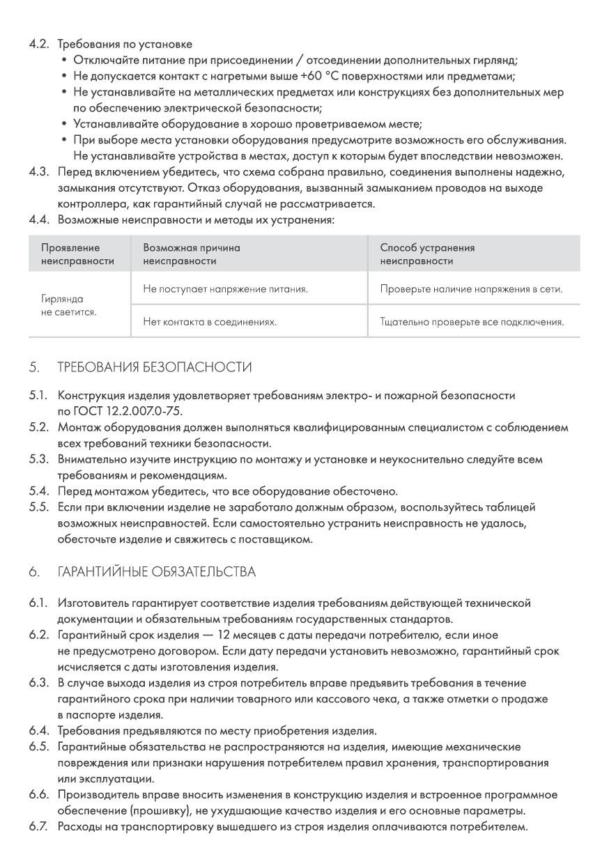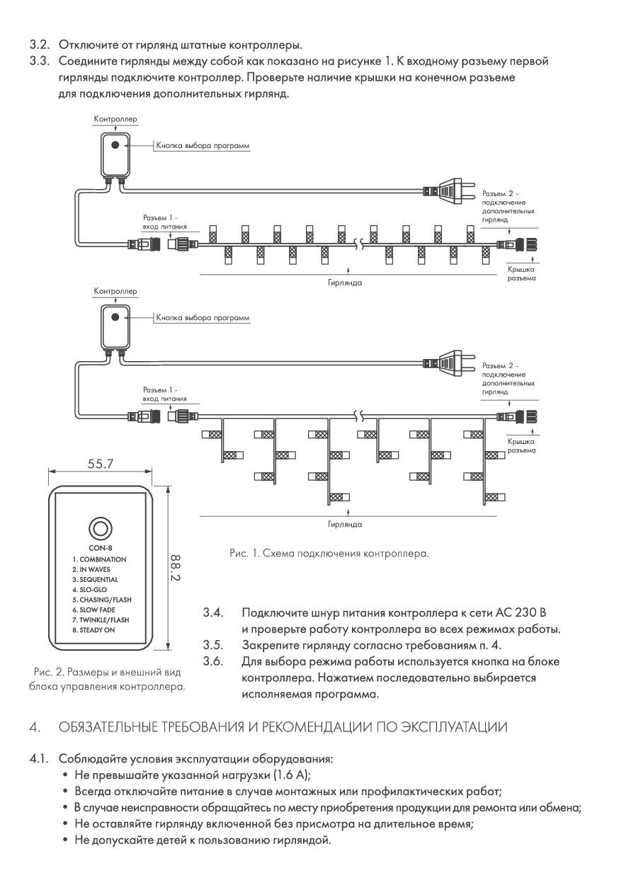 Устройство питается от сети с напряжением 230 В и рассчитано на нагрузку в 1.6 ампера, что обеспечивает надежную и стабильную работу. Дополнительное удобство использования обеспечивает наличие в комплекте выпрямителя AC/DC (1.6A) и 3pin разъема для легкого подключения к гирлянде.