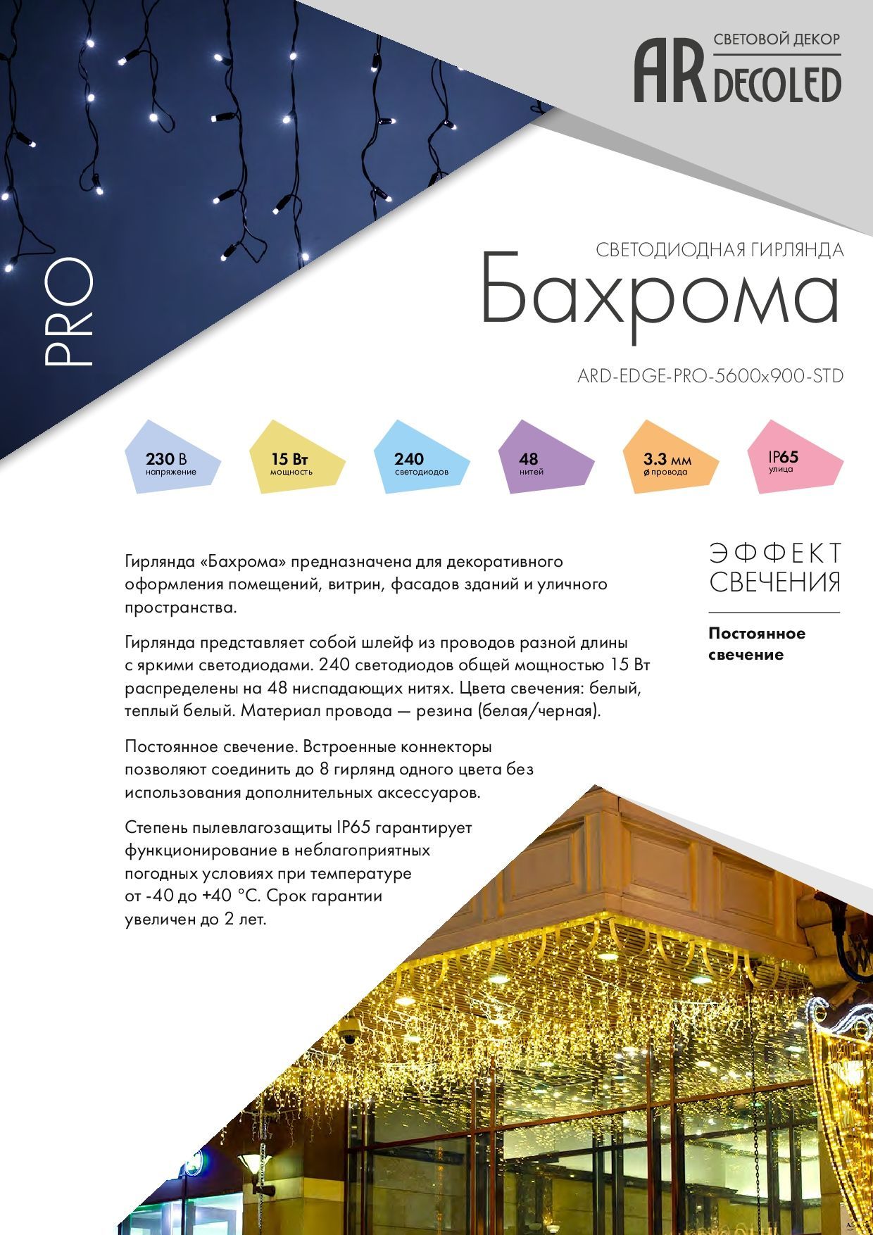 Гирлянда светодиодная ARD-EDGE-PRO-5600x900-WHITE-240LED-STD WARM от бренда Arlight представляет собой универсальное светотехническое решение для создания праздничной атмосферы как в интерьере, так и на улице. Эта модель, входящая в серию Pro, сочетает в себе высокую функциональность и современный дизайн, что делает ее идеальной для использования как профессионалами, так и любителями дизайна.