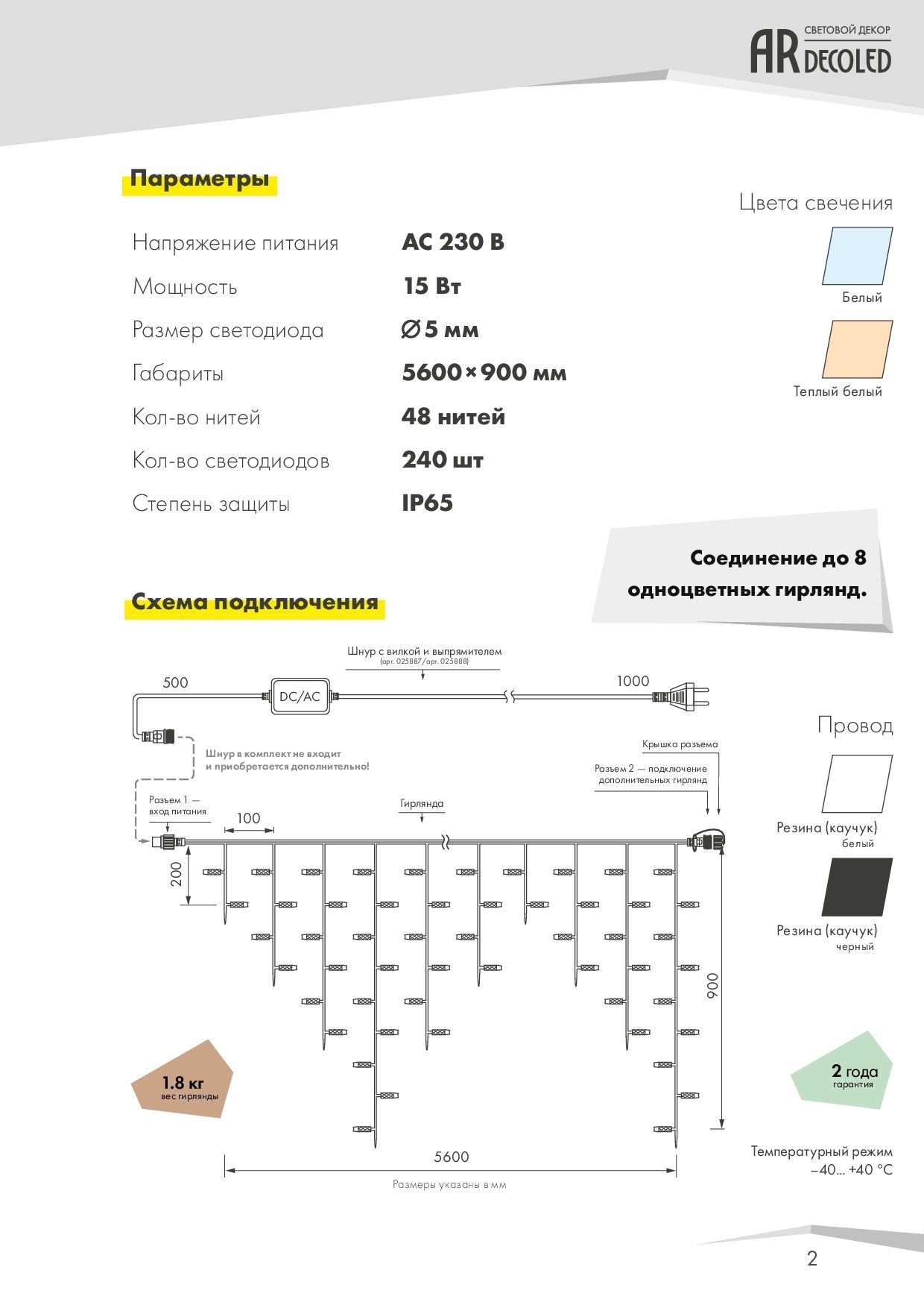 Для подключения гирлянды к сети требуется напряжение 230 В, а для работы она потребляет мощность 15 Вт, что эквивалентно энергопотреблению небольшой лампы накаливания, но с гораздо более высокой эффективностью освещения. Провод выполнен из белого каучука, что обеспечивает гибкость и долговечность, а также минимизирует заметность кабеля на светлом фоне.