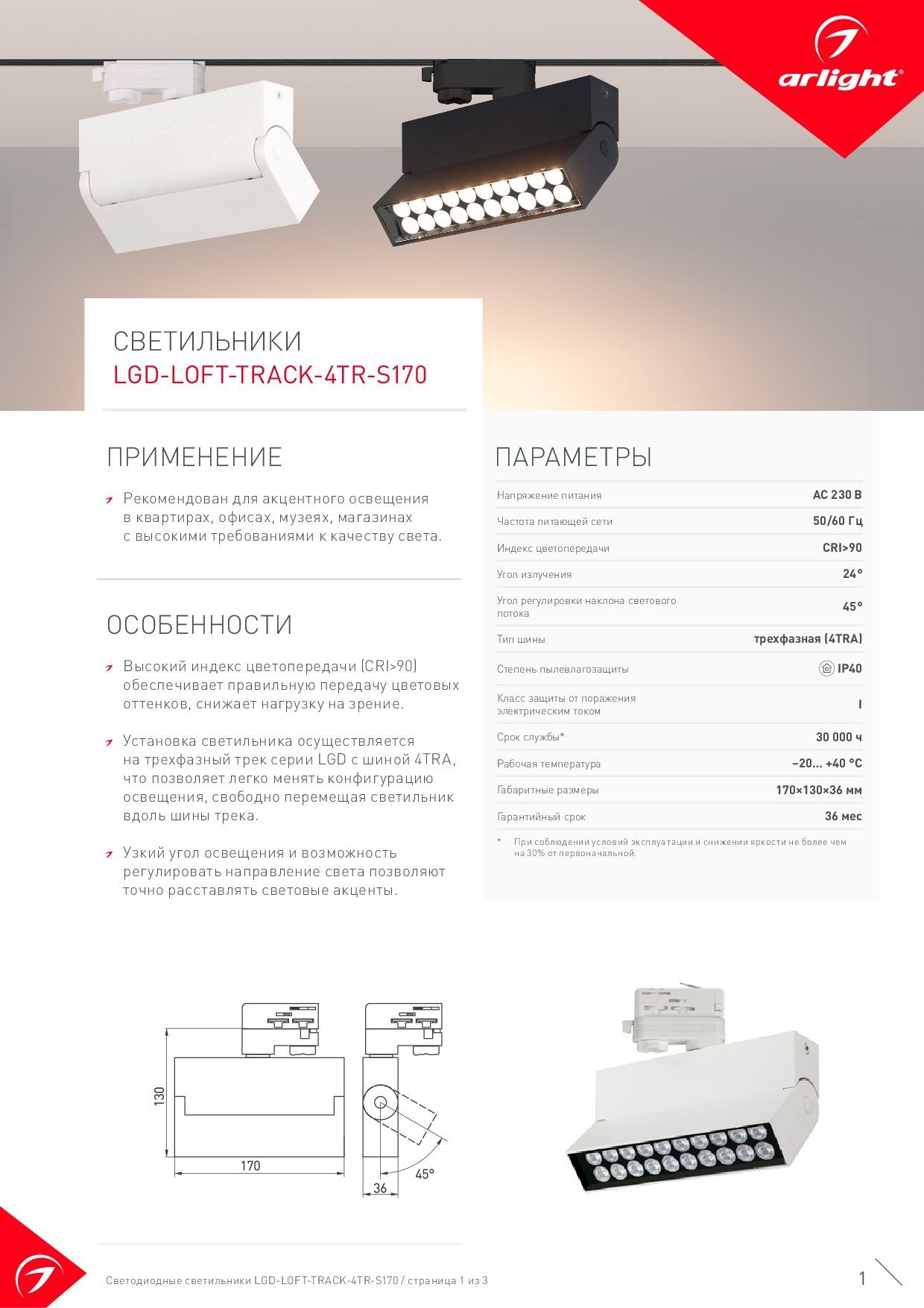 Светильник LGD-LOFT-TRACK-4TR-S170-20W White6000 (BK, 24 deg) (Arlight, IP20 Металл) Arlight 026231
