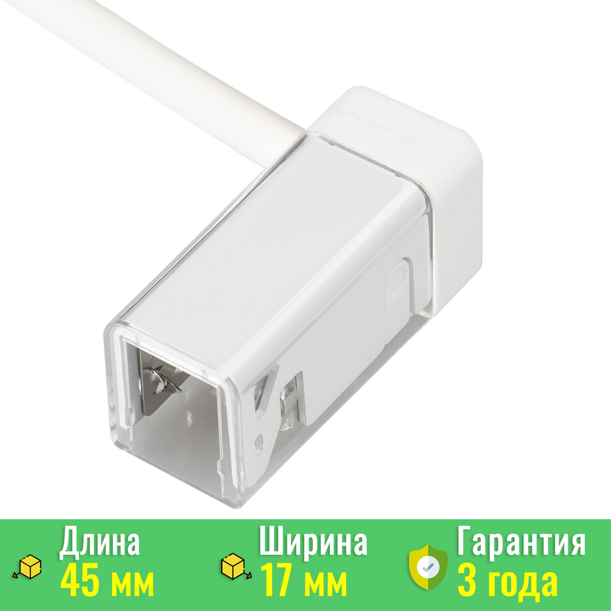 Коннектор принадлежит к серии MOONLIGHT и предназначен для подключения герметичной светодиодной ленты с сечением 17x12 мм. Сам коннектор выполнен из прочного белого пластика, что обеспечивает долговечность и эстетическую привлекательность. Габариты устройства составляют 45х17х20 мм, что делает его компактным и удобным в использовании.
