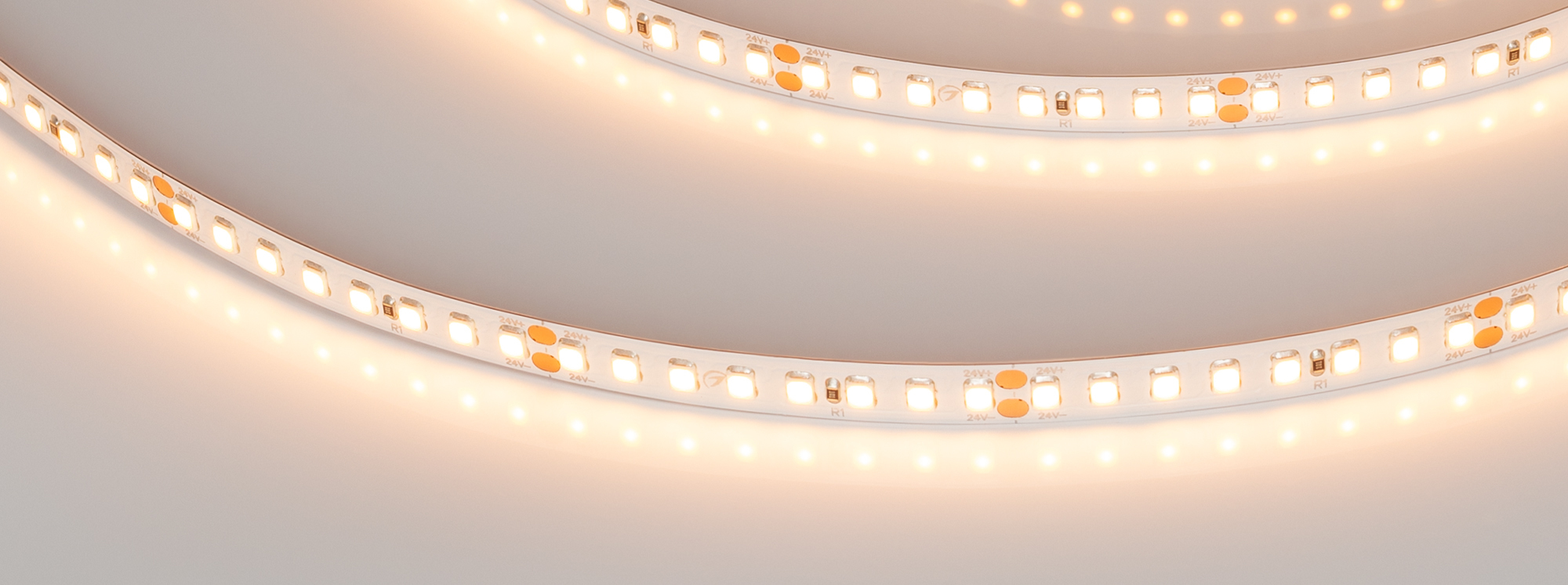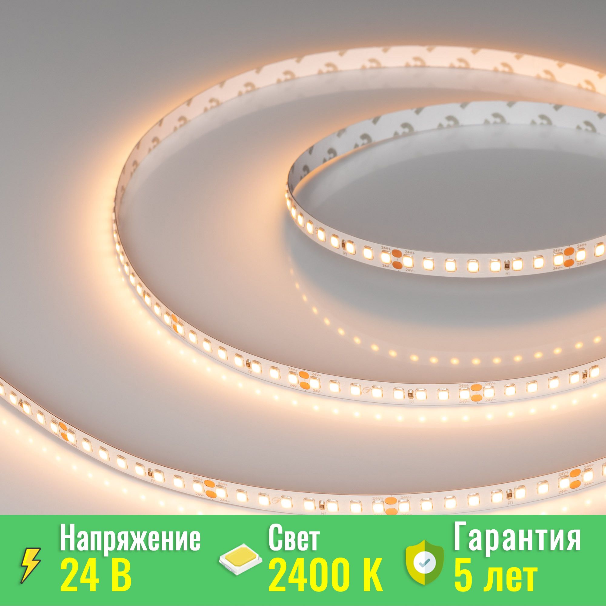 Цвет свечения — тёплый белый с цветовой температурой 2400K, что создает уютную атмосферу в помещении. Высокий индекс цветопередачи (CRI) выше 85 гарантирует естественные и насыщенные цвета освещаемых объектов, поэтому лента идеально подходит для жилых и коммерческих пространств.