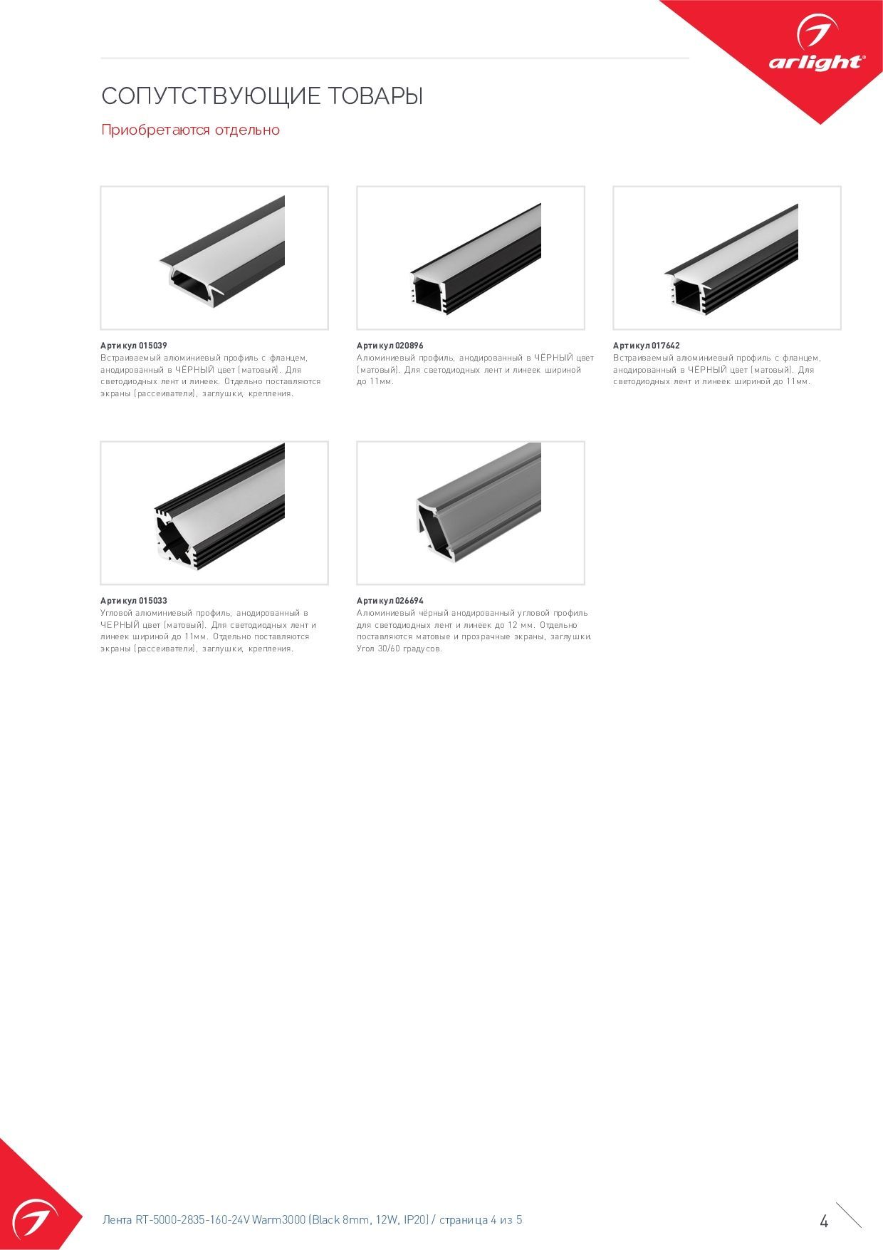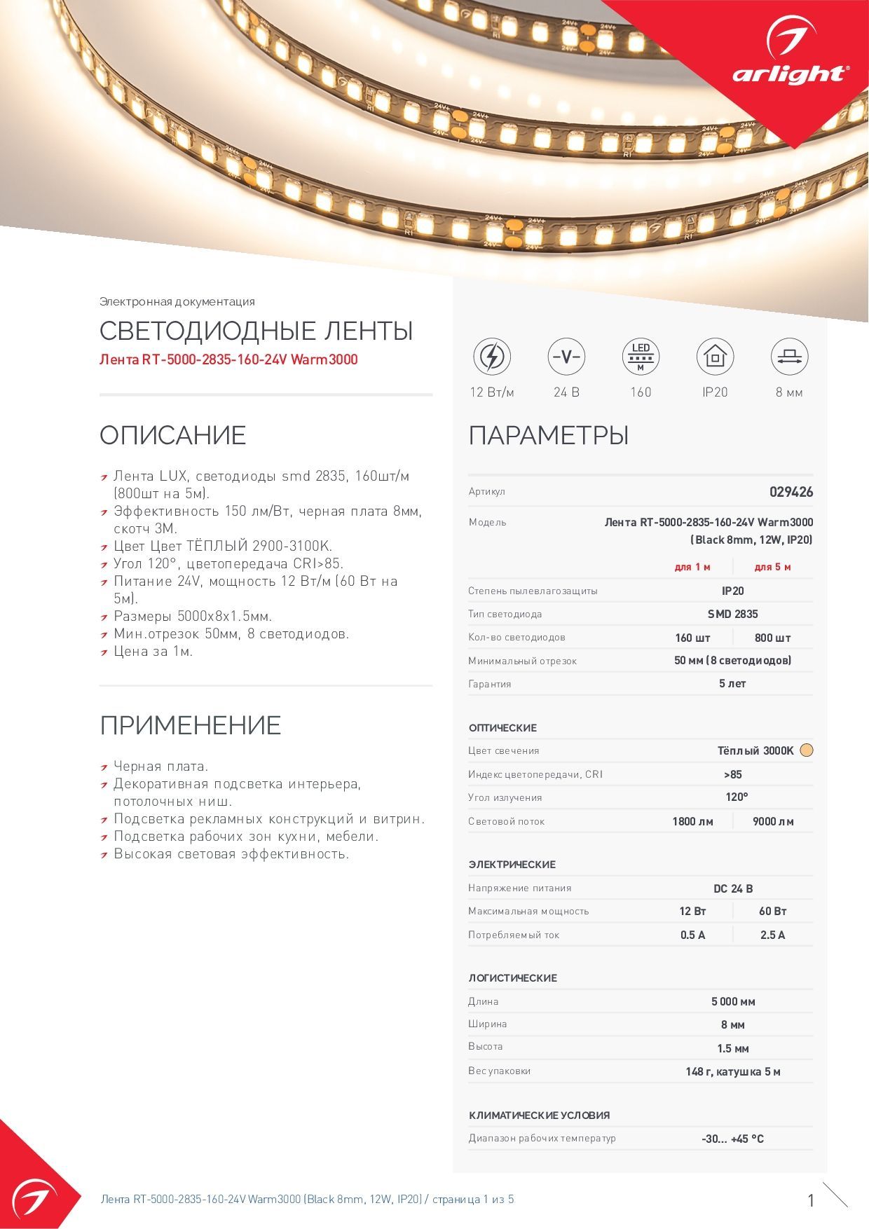 029426 Лента RT-5000-2835-160-24V Warm3000 (Black 8mm, 12W, IP20) (Arlight, -)