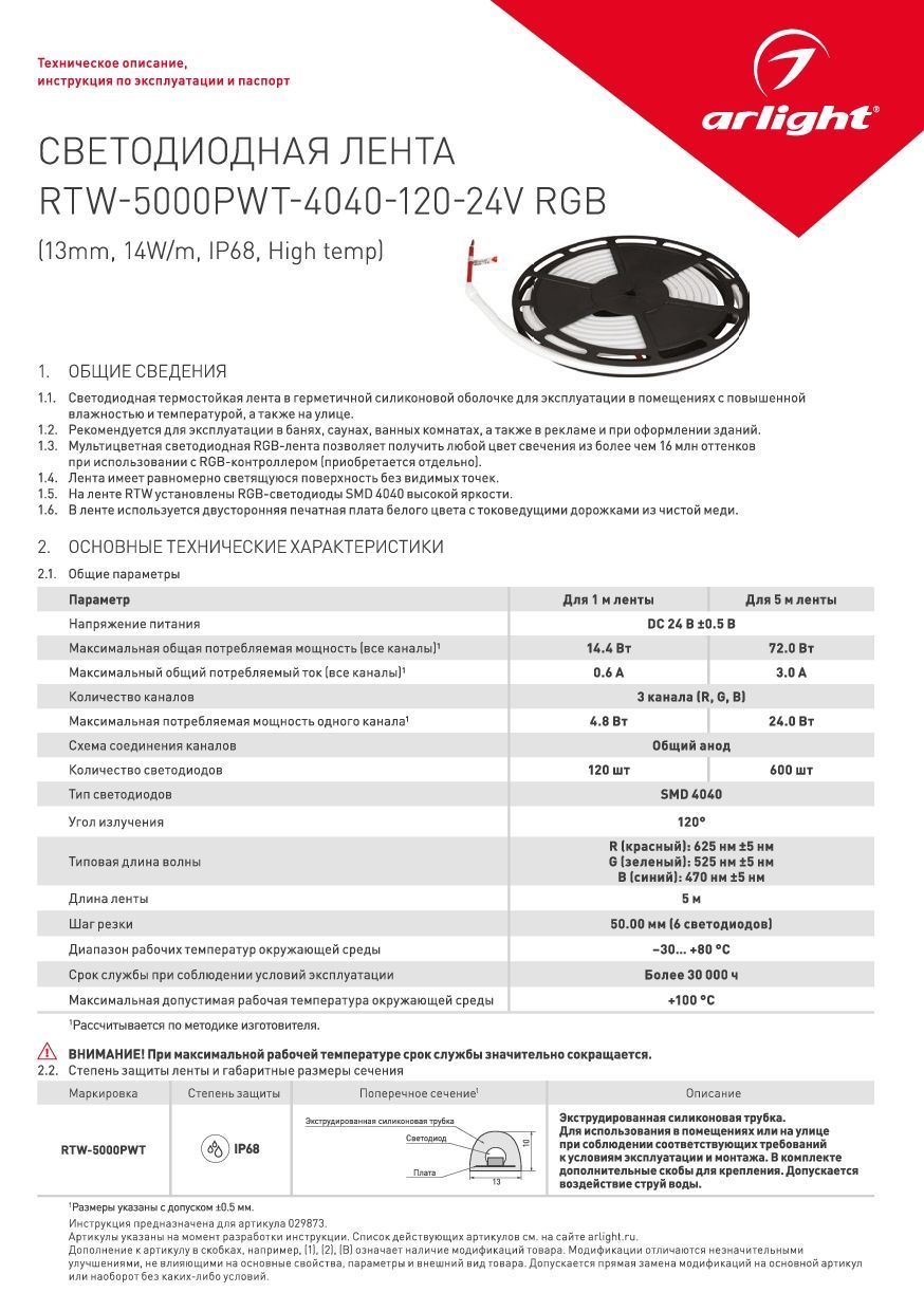Светодиодная лента Arlight RTW-5000PWT-4040-120-24V RGB (13mm, 14W/m, IP68, High temp) (Arlight, Герметичный) (Arlight 029873)