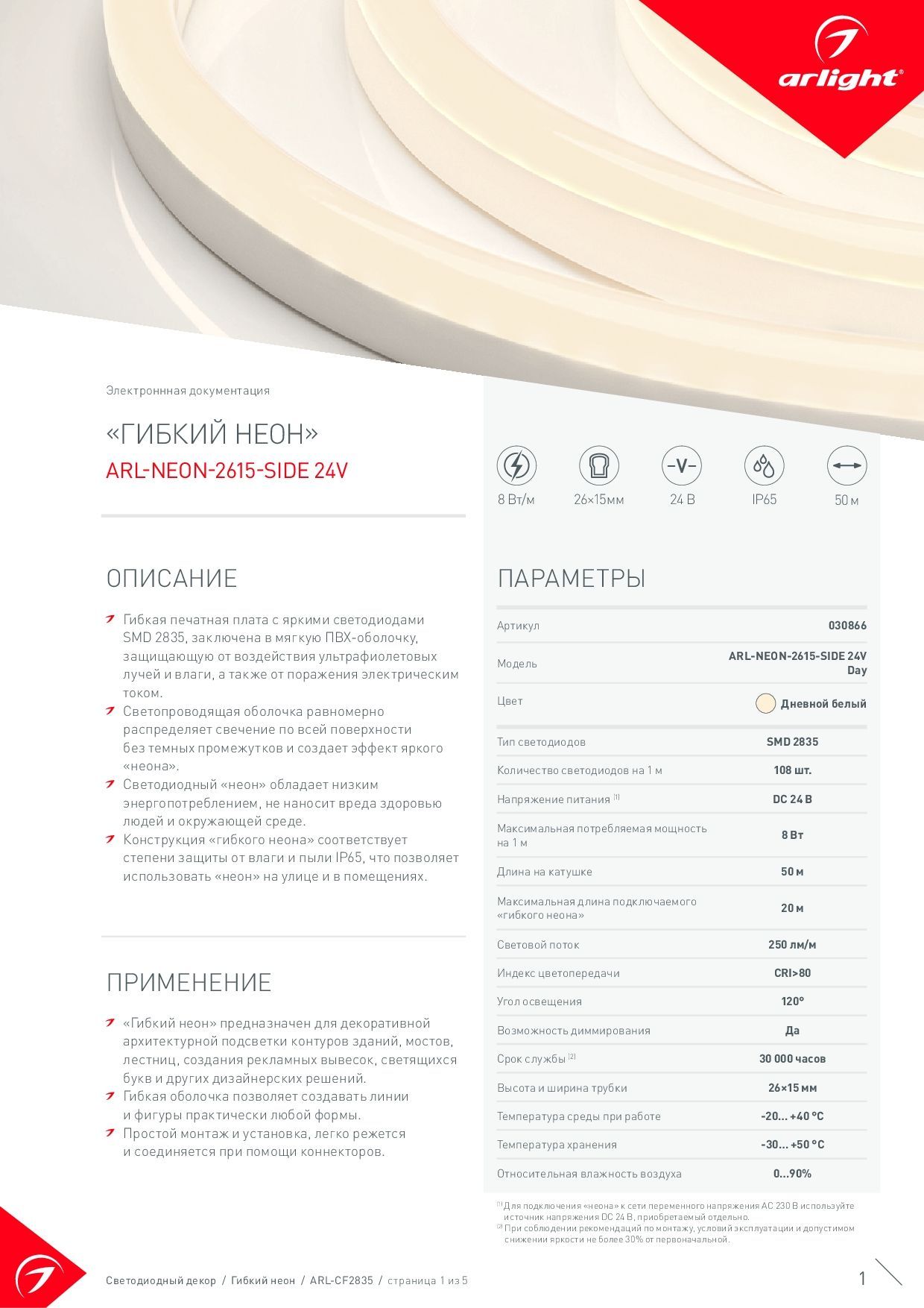 030866 Гибкий неон ARL-NEON-2615-SIDE 24V Day (Arlight, 8 Вт/м, IP65)