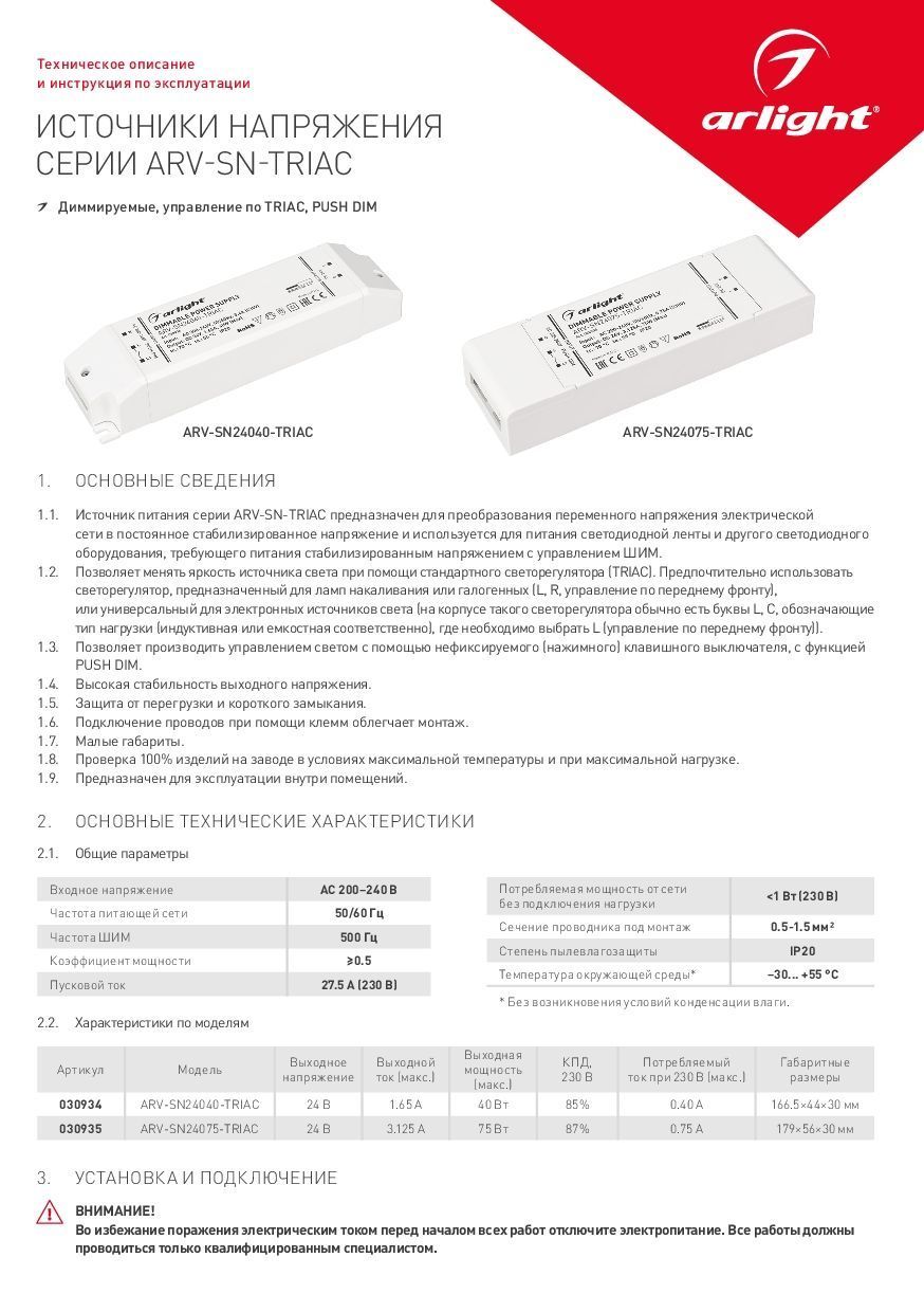 Представляем вам блок питания ARV-SN24075-TRIAC от бренда Arlight, который станет незаменимым компонентом в вашем проекте светодиодного освещения. Этот блок питания обеспечивает стабильную работу и возможность управления яркостью множества светодиодных изделий.