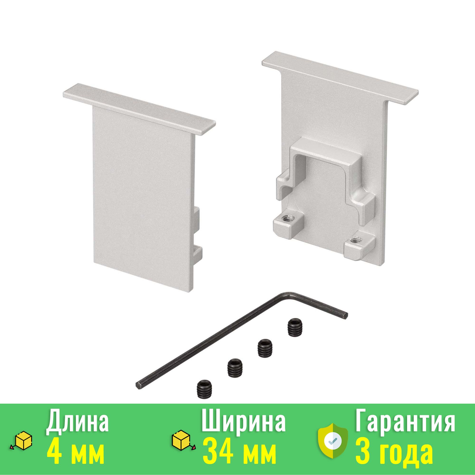 Комплект включает в себя пару заглушек, что очень удобно для стандартного монтажа на обоих концах профиля. В набор также входят четыре винта и шестигранный ключ, обеспечивая легкость и точность установки. Гарантия на изделие составляет 36 месяцев.