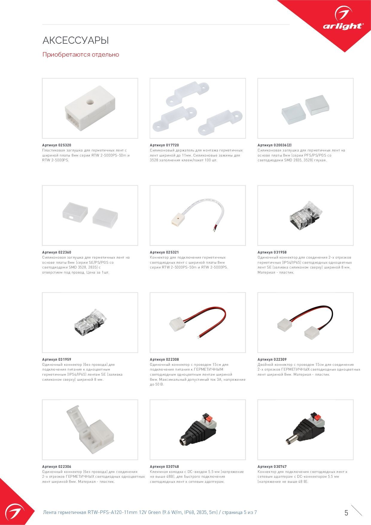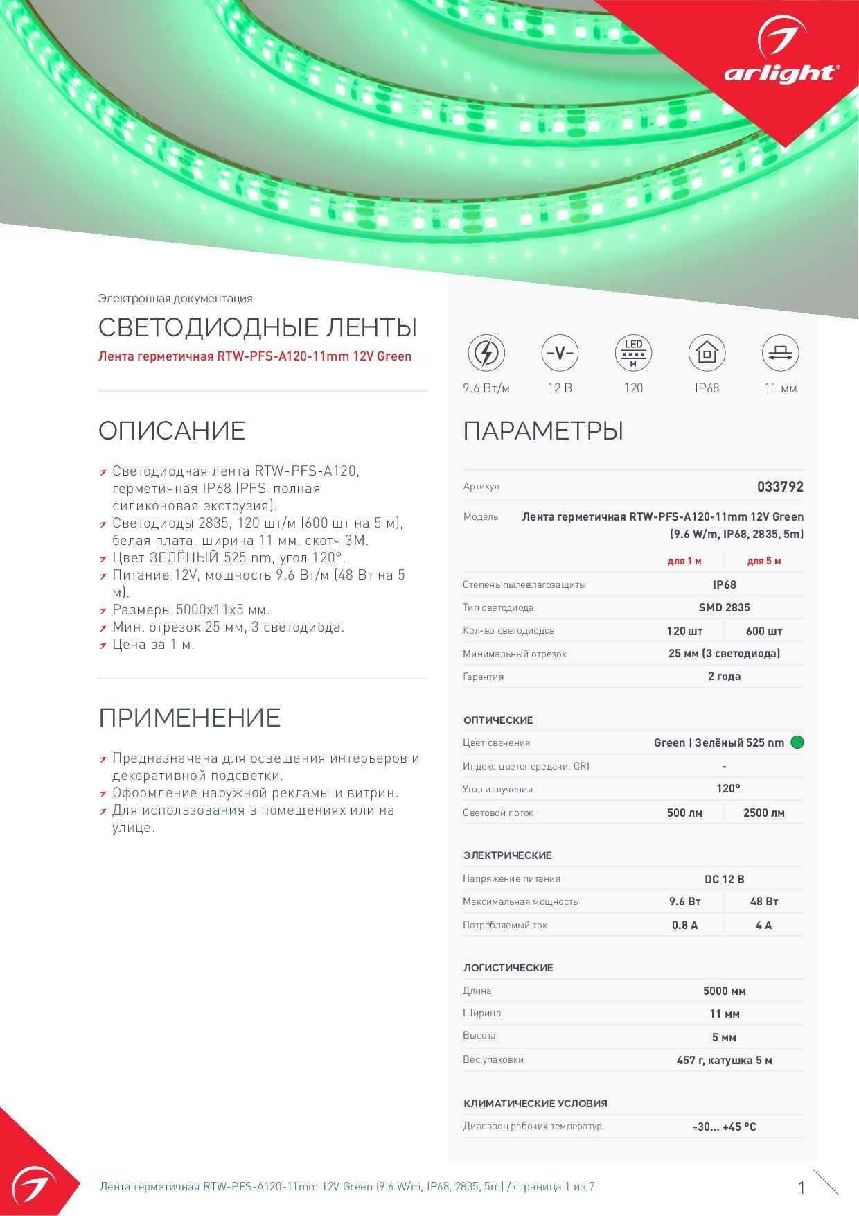 033792 Лента герметичная RTW-PFS-A120-11mm 12V Green (9.6 W/m, IP68, 2835, 5m) (Arlight, 9.6 Вт/м, IP68)