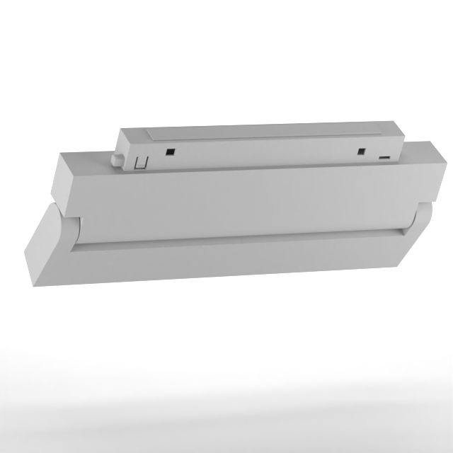 Светильник выполнен в элегантном белом прямоугольном корпусе из качественного металла и оснащён экраном из поликарбоната, что делает его прочным и долговечным. Он легко крепится на магнитный трек благодаря магнитам и механическим фиксаторам. Конструкция позволяет поворачивать светильник на 90 градусов вертикально относительно потолка, что предоставляет гибкость в настройке освещения.