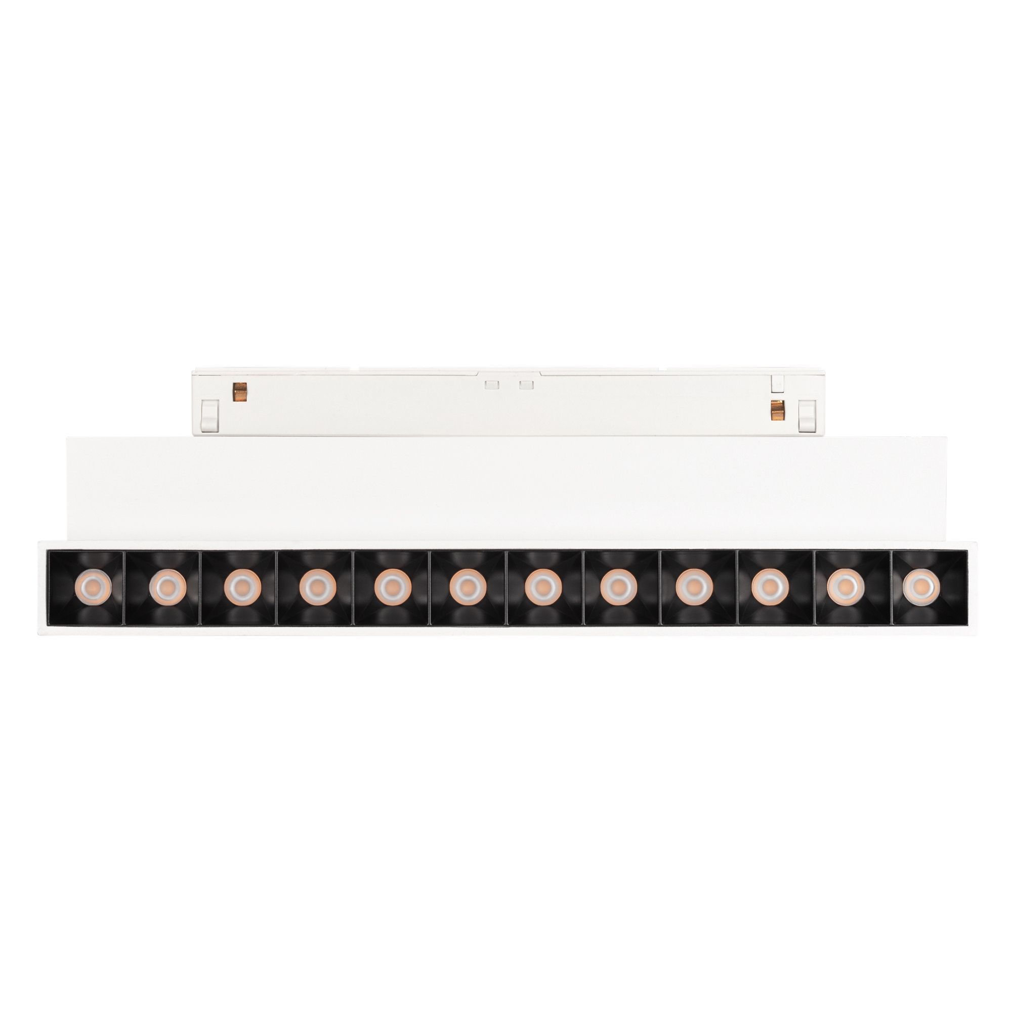 Светильник выполнен в элегантном белом прямоугольном корпусе из качественного металла и оснащён экраном из поликарбоната, что делает его прочным и долговечным. Он легко крепится на магнитный трек благодаря магнитам и механическим фиксаторам. Конструкция позволяет поворачивать светильник на 90 градусов вертикально относительно потолка, что предоставляет гибкость в настройке освещения.