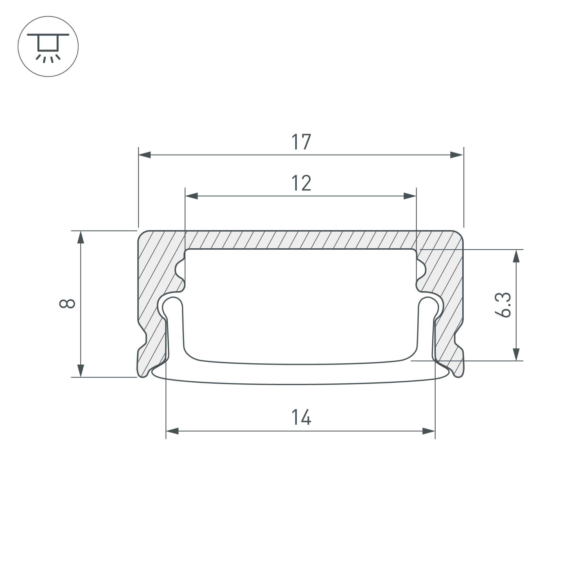 Габаритные размеры профиля составляют значительные 2000 мм в длину, 17 мм в ширину и 8 мм в высоту, что позволяет легко интегрировать его в любые проекты по освещению. Площадка для установки светодиодных лент имеет ширину 12 мм, что предоставляет гибкость в выборе лент мощностью до 13 Вт на один метр. Благодаря этим характеристикам, профиль идеально подходит для реализации сложных схем контурной подсветки и создания современных световых решений.