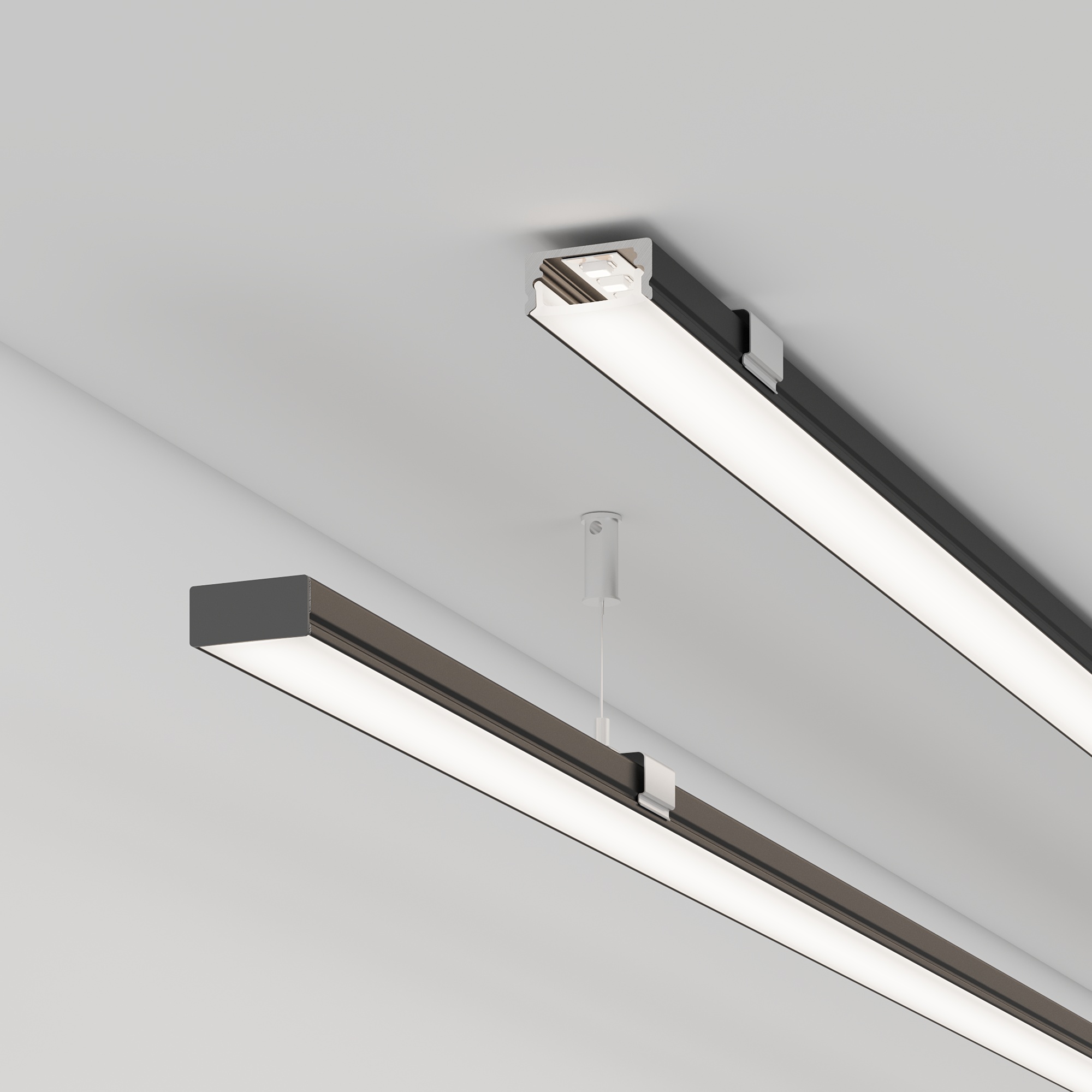 Для подвесного монтажа необходимо использовать специальные подвесы в сочетании с держателями, расширяющими возможности применения профиля в различных интерьерах и световых инсталляциях. Экраны, заглушки и другие аксессуары, такие как модель экрана A16F, не входят в комплект и приобретаются отдельно, что позволяет настроить освещение по своему усмотрению.