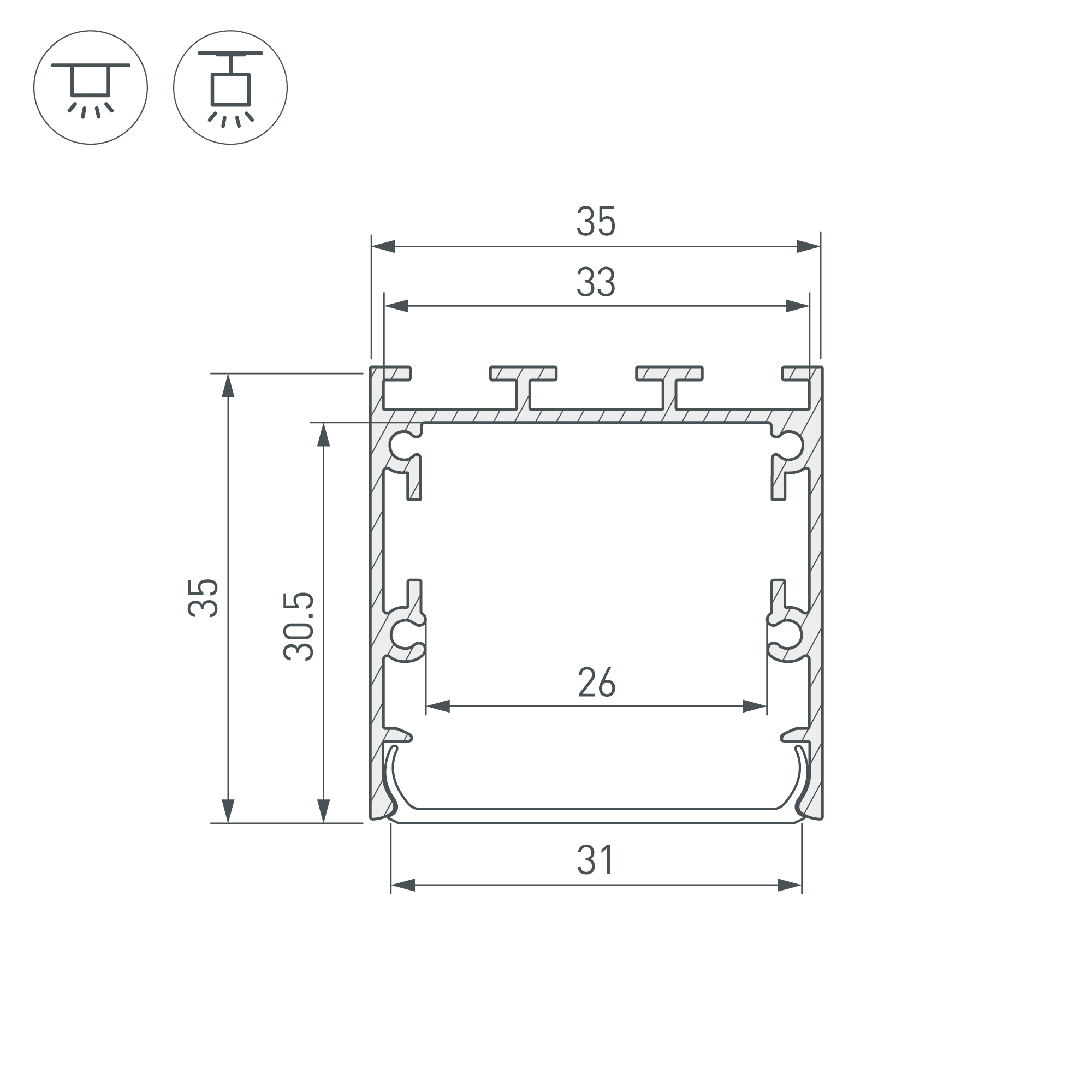 - Габаритные размеры: Длина - 2500 мм, ширина - 35 мм, высота - 35,5 мм. Оптимальная ширина площадки для светодиодной ленты до 26 мм.
