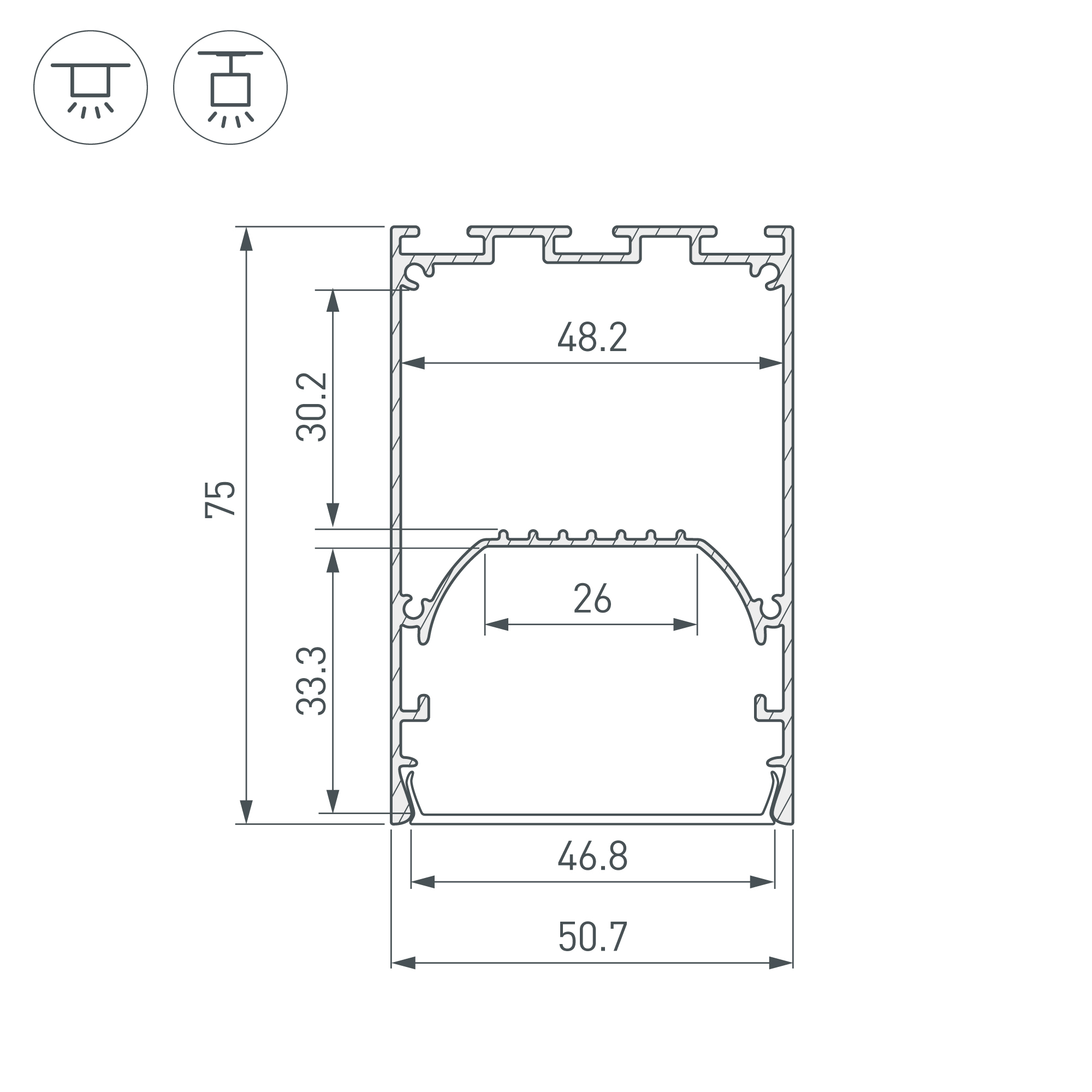 - Отсек для блока питания: Имеет размеры 48,2 мм в ширину и 30,2 мм в высоту, что обеспечивает удобство при установке и организации питания светильника.